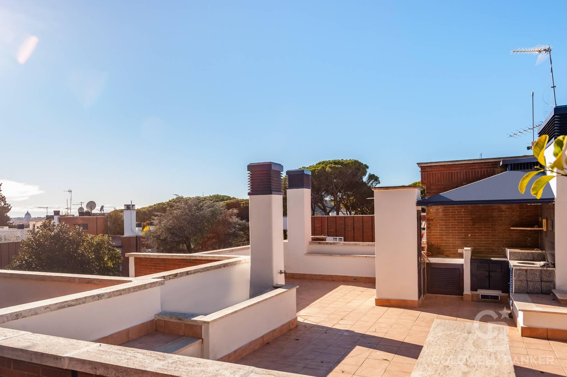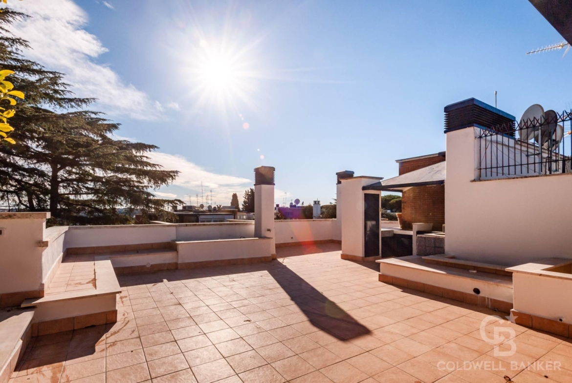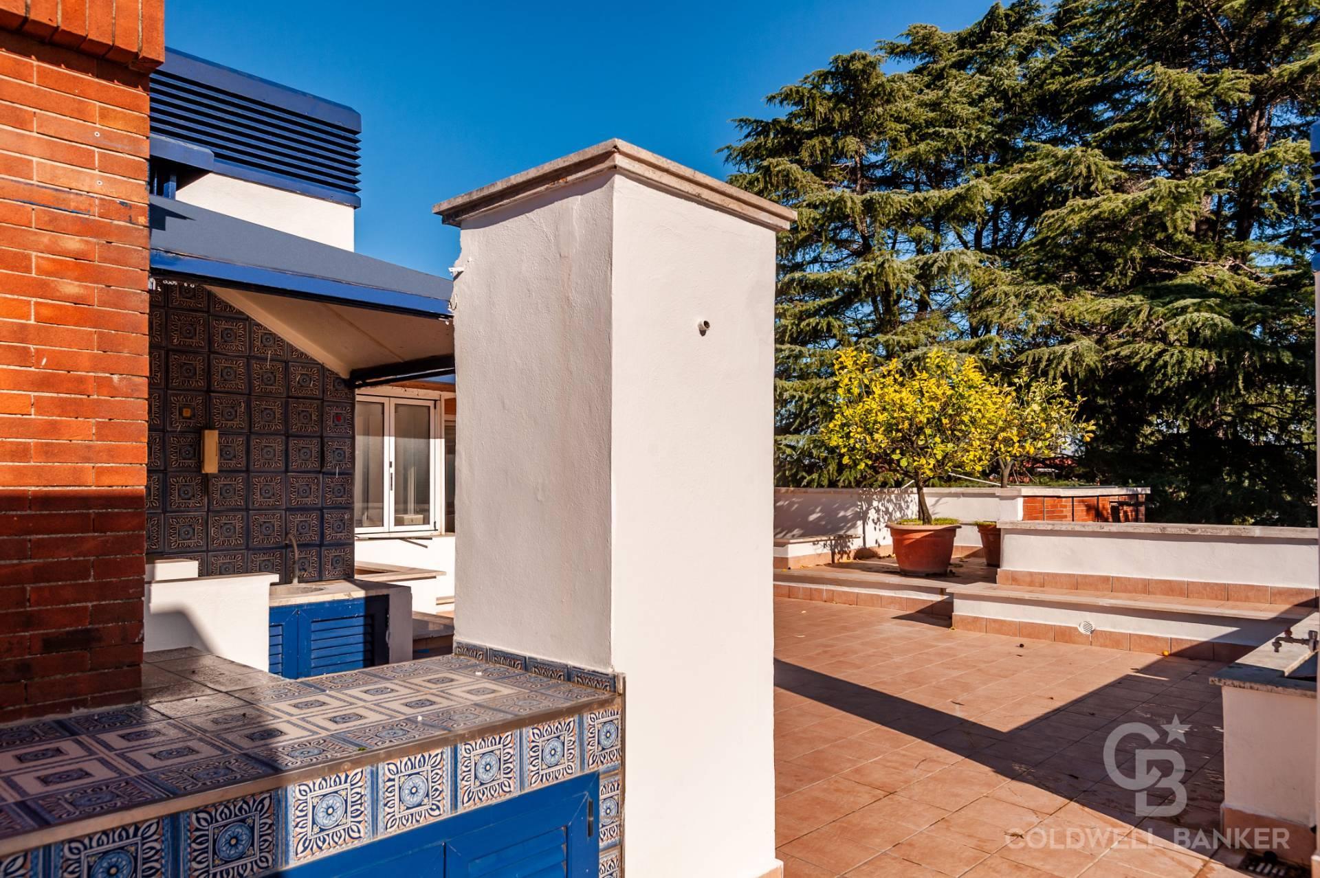 Al piano superattico, raggiunto da scala interna, si trovano: due immense terrazze panoramiche divise da una parte coperta, chiusa da vetrate, e una incantevole cucina da esterno in muratura servita da un montacarichi. La vista qui spazia da San Pietro ai Castelli Romani, dal Terminillo all’Auditorium.
