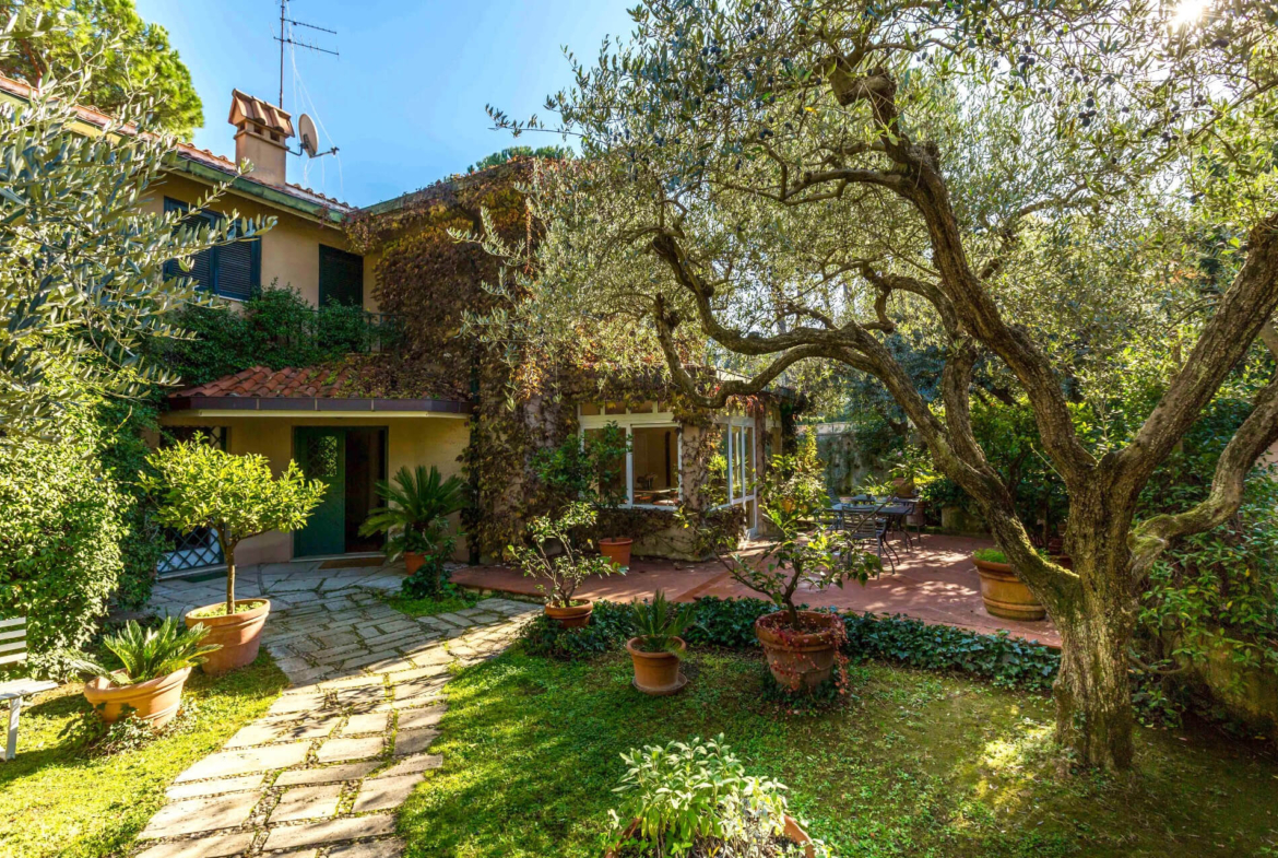 Il giardino di circa 1.100 mq. circonda la villa e tramite un vialetto di pochi metri conduce direttamente alla piscina.