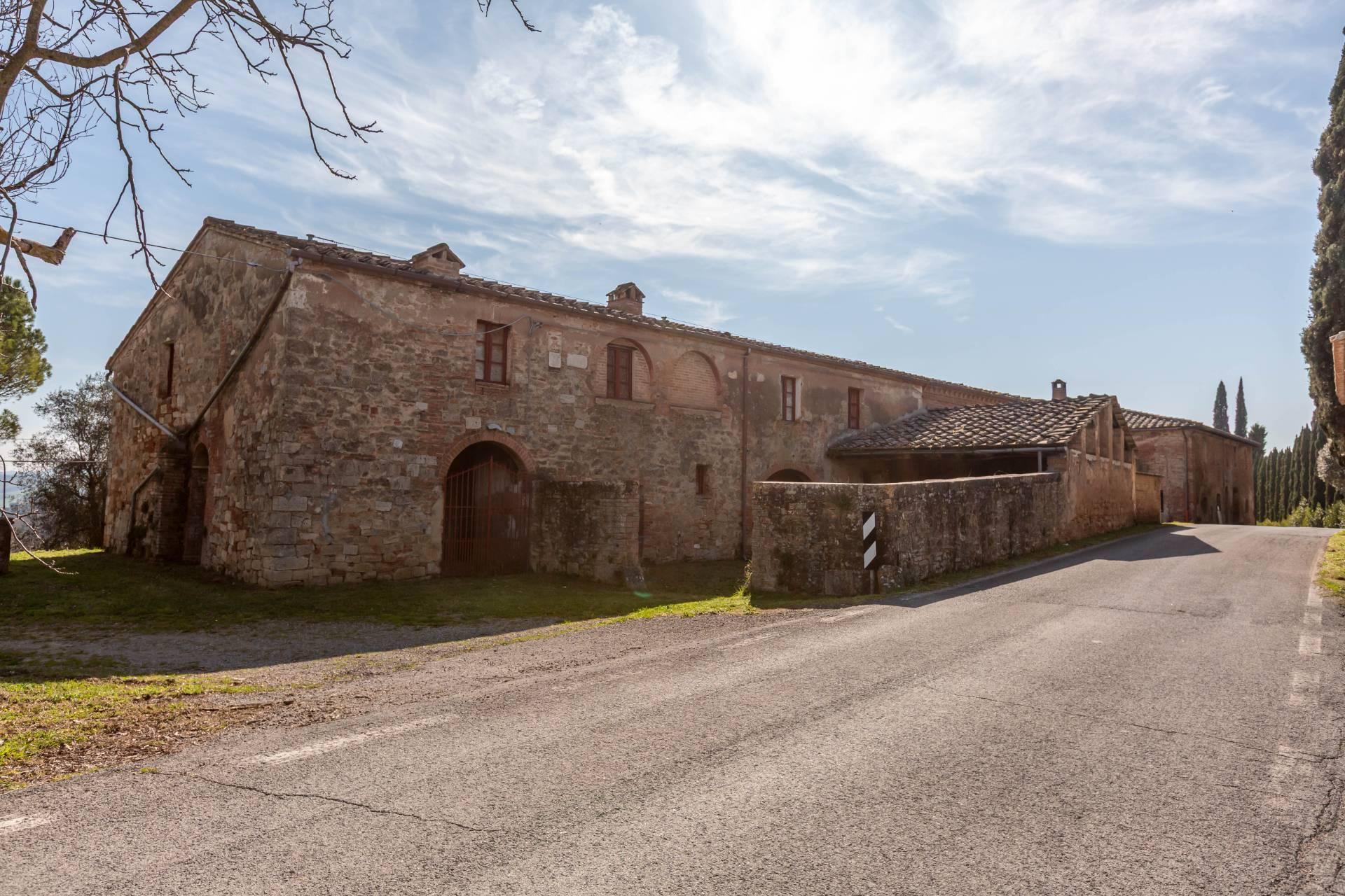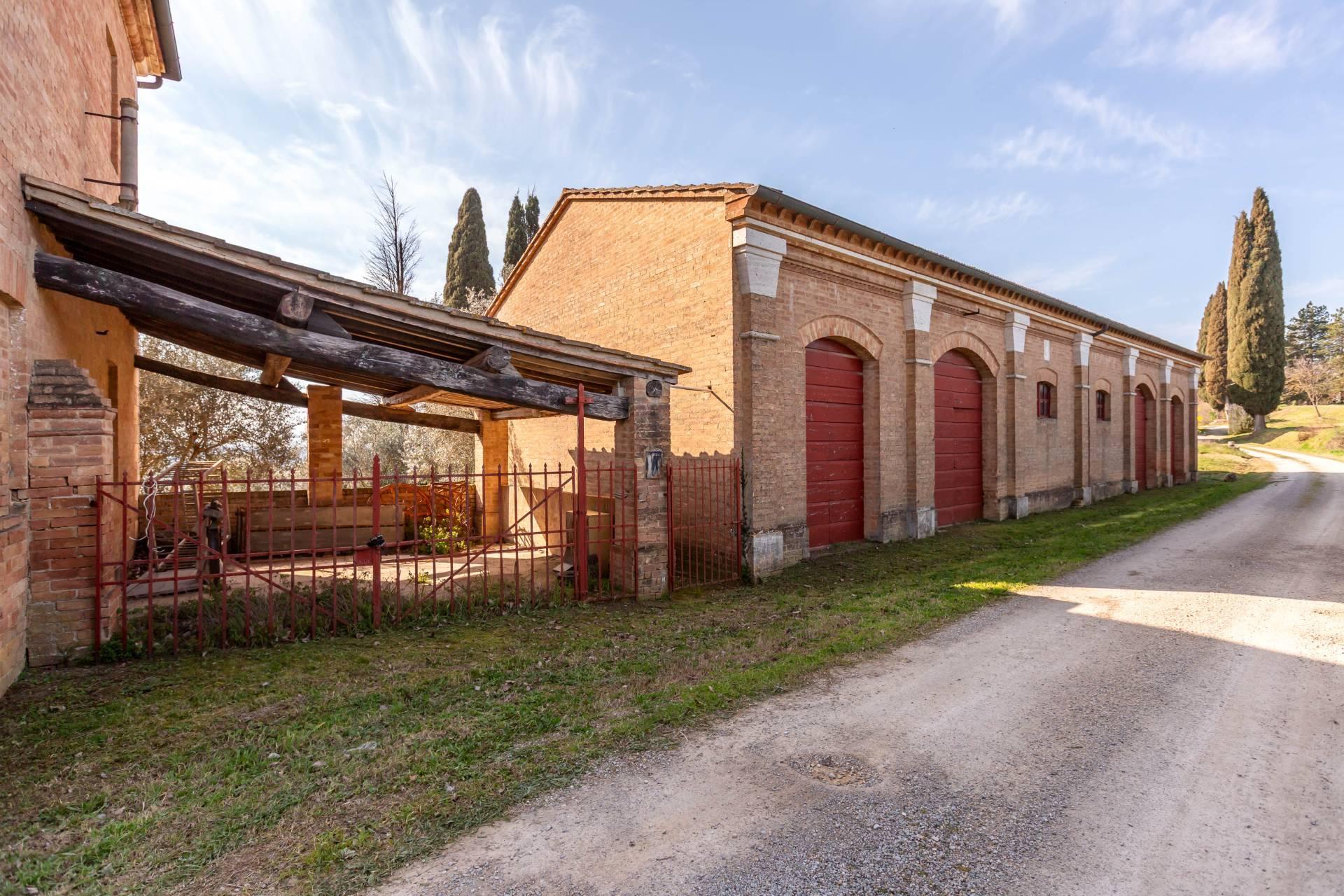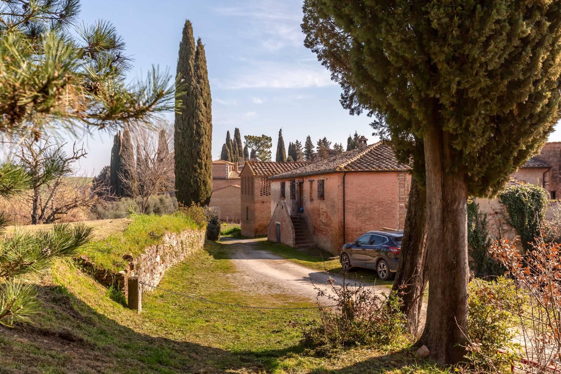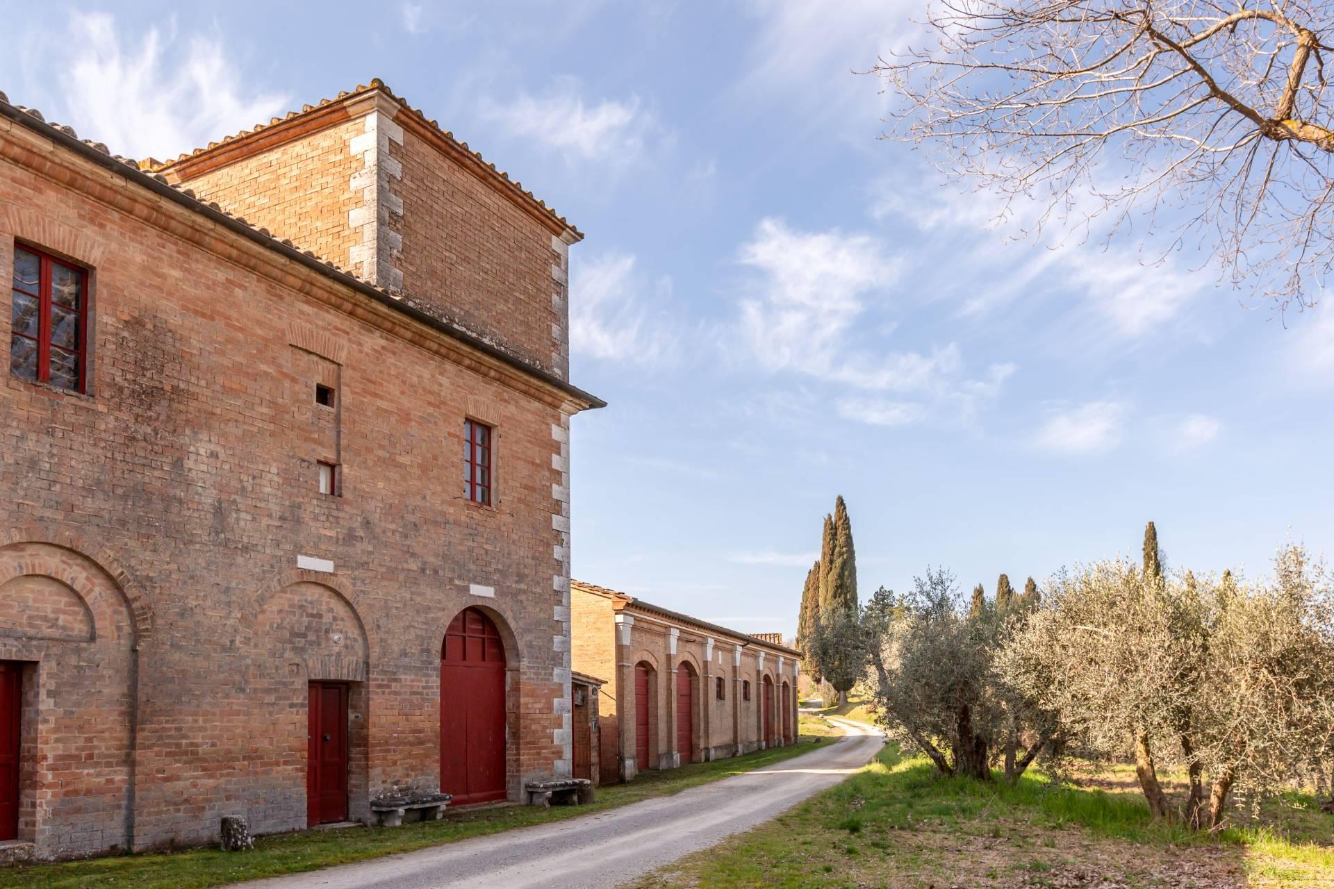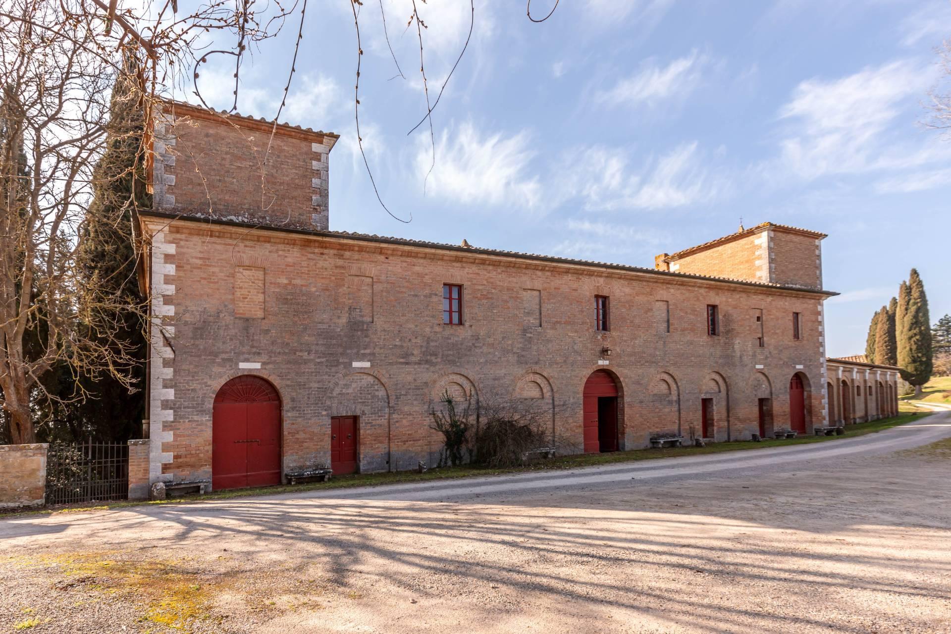 ASCIANO (SI) – A poca distanza dal centro abitato, nel suggestivo paesaggio delle “Crete senesi”, in posizione dominante e panoramica all’interno di un magnifico territorio vallivo e collinare che cambia colore al variare della stagione, abbiamo il piacere di proporre in vendita un complesso immobiliare di considerevoli dimensioni. Estesa su una superficie di circa 120 ettari di terreno, la proprietà comprende una costruzione principale ed una serie di altri distinti casali e fabbricati, dislocati lungo la via provinciale, per una superficie coperta complessiva di oltre 4.000mq. Il più importante dei quali facente parte di un borgo edificato in epoca rinascimentale ed appartenuto ad una nobile famiglia senese, dalla quale ha preso il nome. Nel primo edificio troviamo due grandi appartamenti attigui posti al piano primo, accessibili da scale indipendenti e ciascuno collegato direttamente alle rispettive torrette; al piano inferiore un grandissimo ambiente, destinato a quella che era l’antica “vinaia”, con soffitti alti 6mt. e spazi di generose dimensioni da destinare a qualunque altro diverso progetto abitativo. Un secondo edificio subito accanto, nel quale troviamo diversi annessi tecnici, tra i quali la grandissima autorimessa destinata ai mezzi agricoli, anche questa con soffitti molto alti e travi in castagno a vista. Merita infine un cenno a parte il favoloso giardino sul quale la costruzione si affaccia, uno dei pochi giardini di interesse storico culturale posto a tutela delle belle arti, oltre cui si scorge il panorama ricco di colline verdi e viali di cipressi, tipici di questa parte della Toscana.