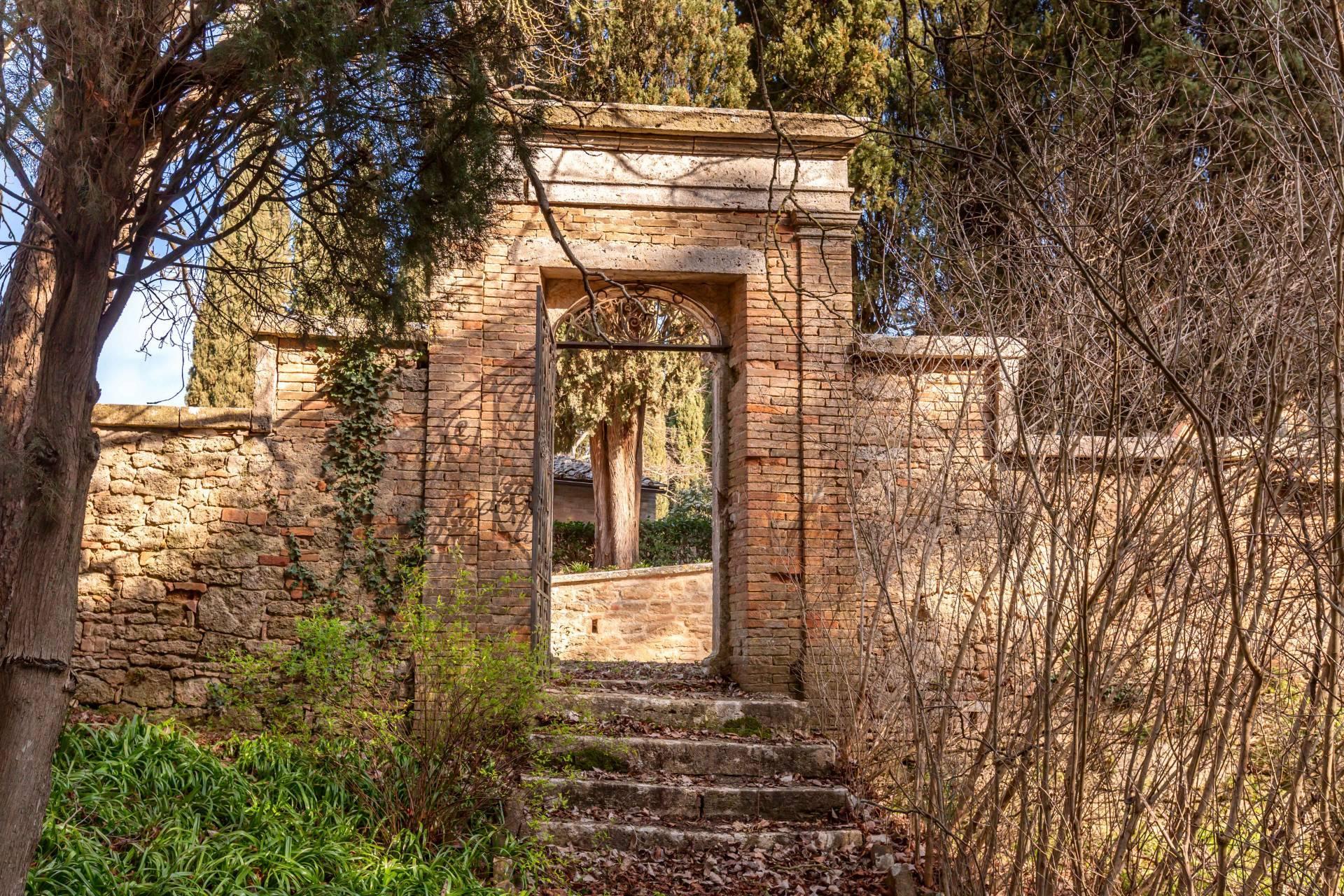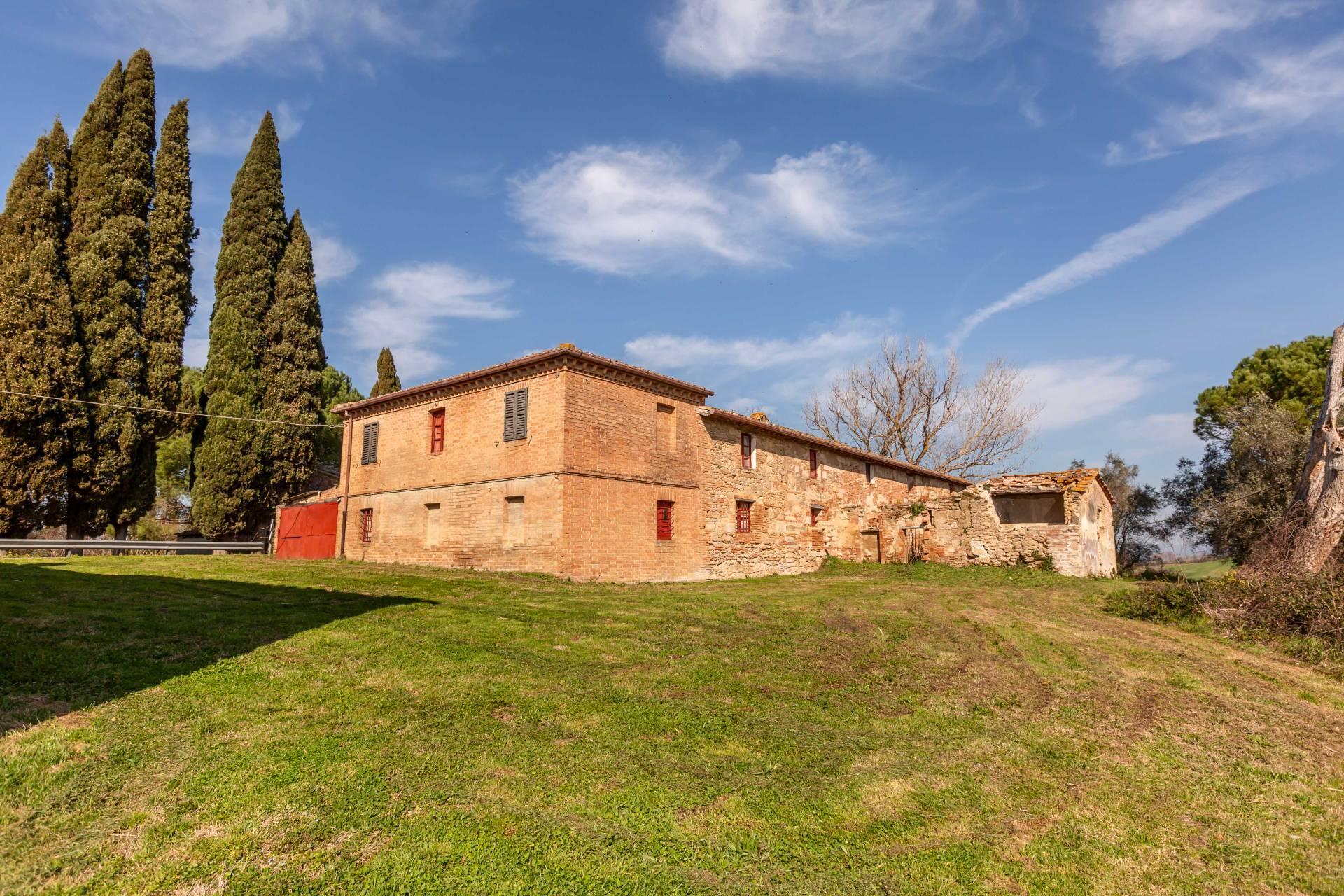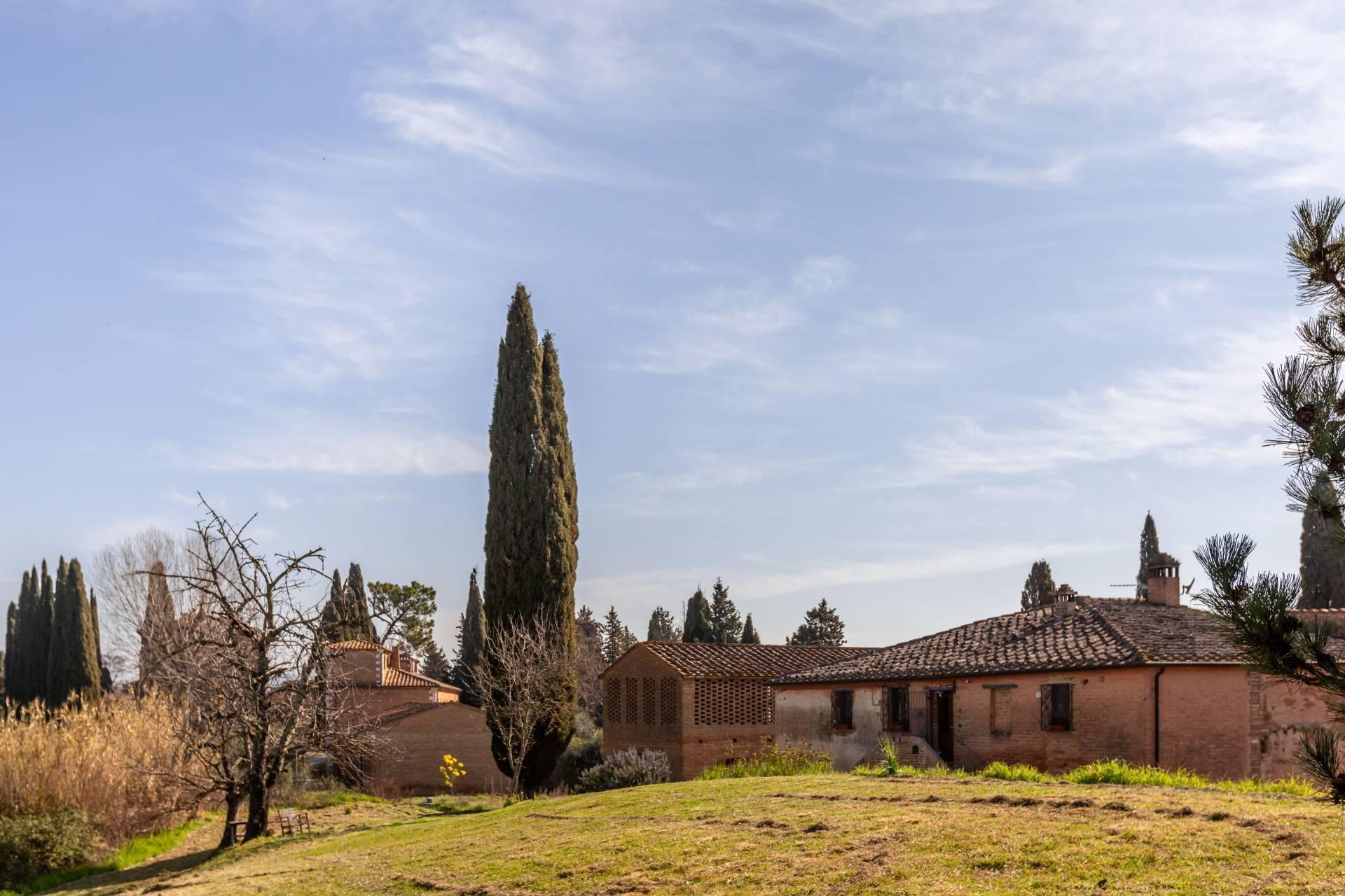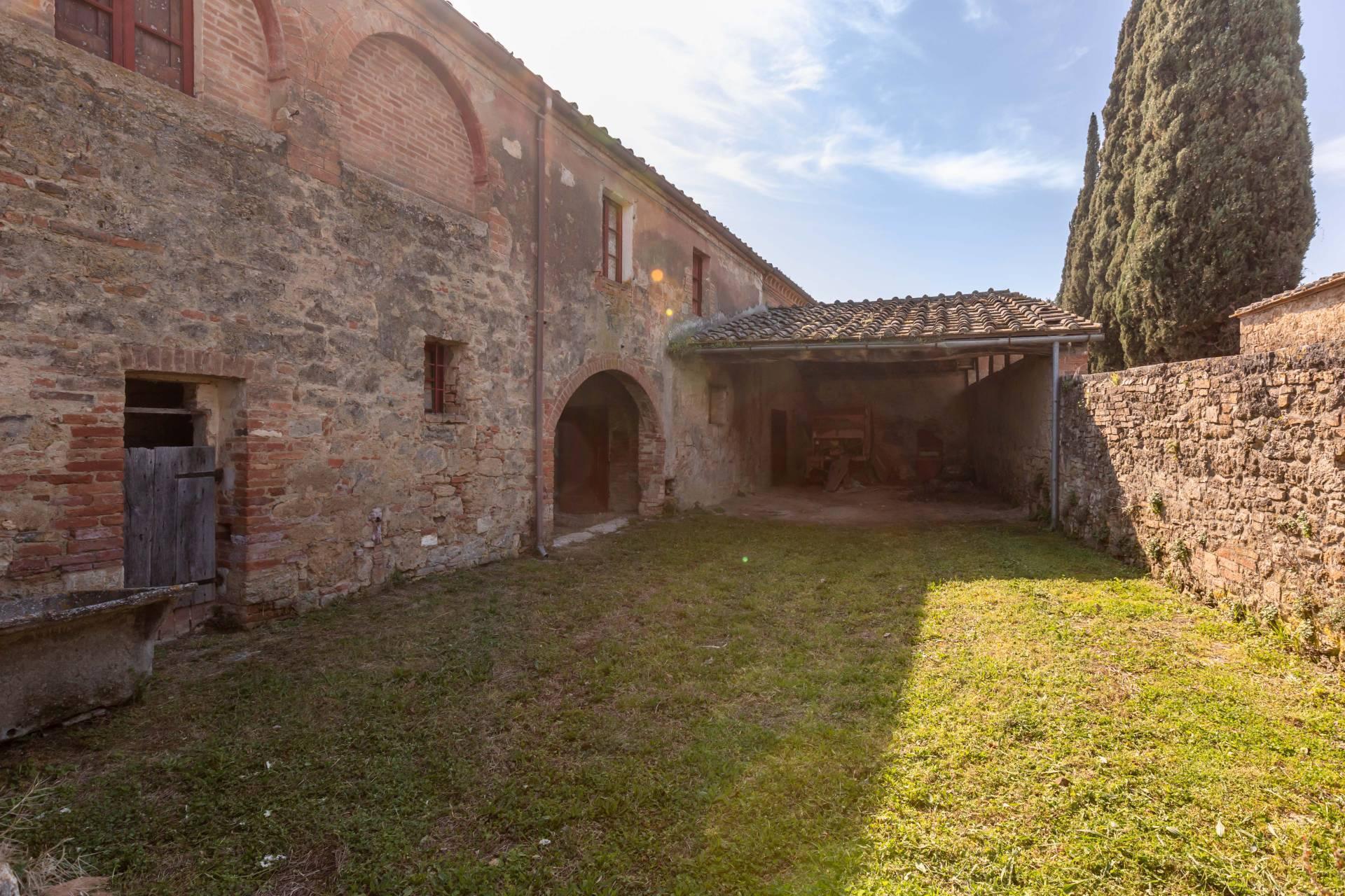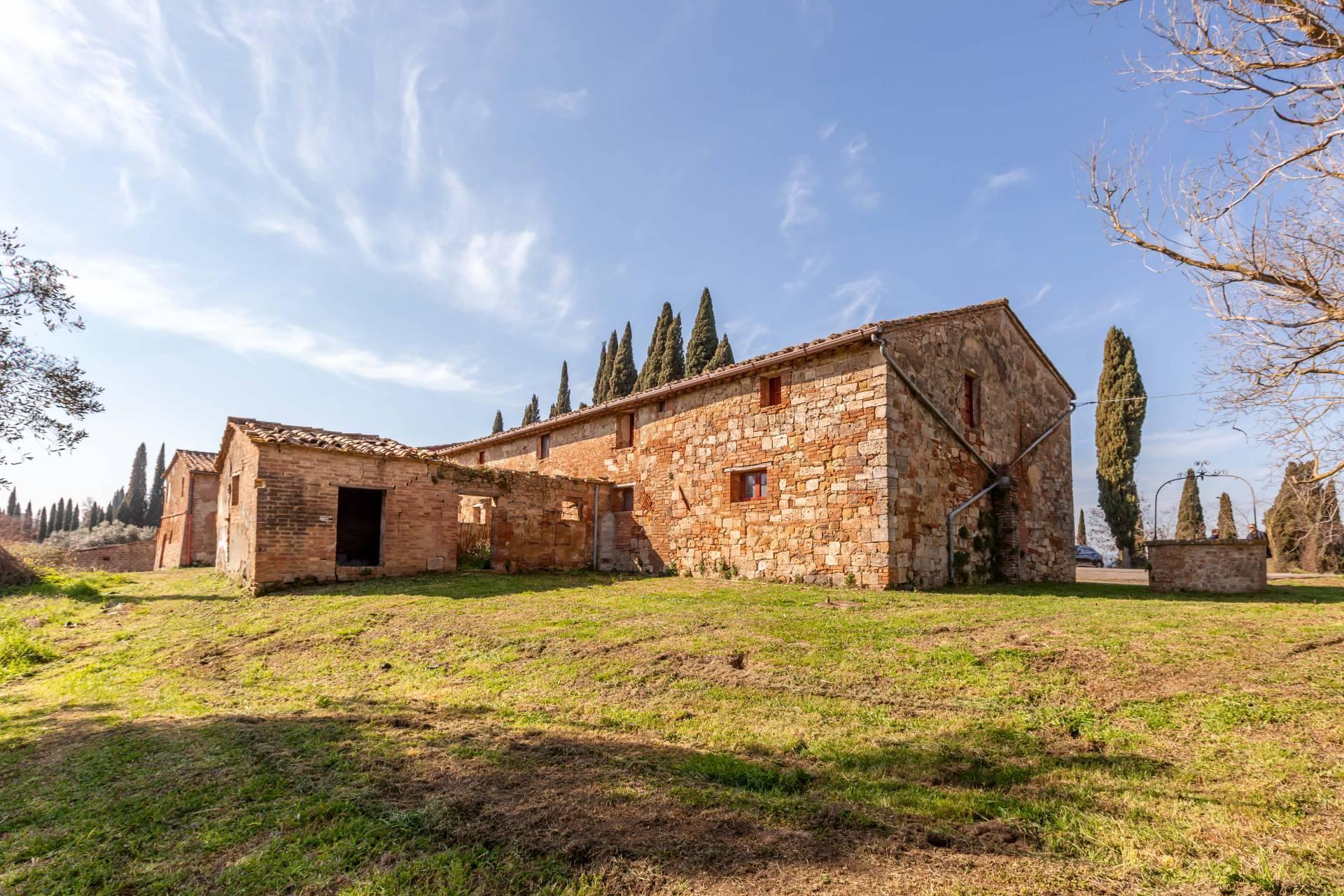 ASCIANO (SI) – A poca distanza dal centro abitato, nel suggestivo paesaggio delle “Crete senesi”, in posizione dominante e panoramica all’interno di un magnifico territorio vallivo e collinare che cambia colore al variare della stagione, abbiamo il piacere di proporre in vendita un complesso immobiliare di considerevoli dimensioni. Estesa su una superficie di circa 120 ettari di terreno, la proprietà comprende una costruzione principale ed una serie di altri distinti casali e fabbricati, dislocati lungo la via provinciale, per una superficie coperta complessiva di oltre 4.000mq. Il più importante dei quali facente parte di un borgo edificato in epoca rinascimentale ed appartenuto ad una nobile famiglia senese, dalla quale ha preso il nome. Nel primo edificio troviamo due grandi appartamenti attigui posti al piano primo, accessibili da scale indipendenti e ciascuno collegato direttamente alle rispettive torrette; al piano inferiore un grandissimo ambiente, destinato a quella che era l’antica “vinaia”, con soffitti alti 6mt. e spazi di generose dimensioni da destinare a qualunque altro diverso progetto abitativo. Un secondo edificio subito accanto, nel quale troviamo diversi annessi tecnici, tra i quali la grandissima autorimessa destinata ai mezzi agricoli, anche questa con soffitti molto alti e travi in castagno a vista. Merita infine un cenno a parte il favoloso giardino sul quale la costruzione si affaccia, uno dei pochi giardini di interesse storico culturale posto a tutela delle belle arti, oltre cui si scorge il panorama ricco di colline verdi e viali di cipressi, tipici di questa parte della Toscana.
