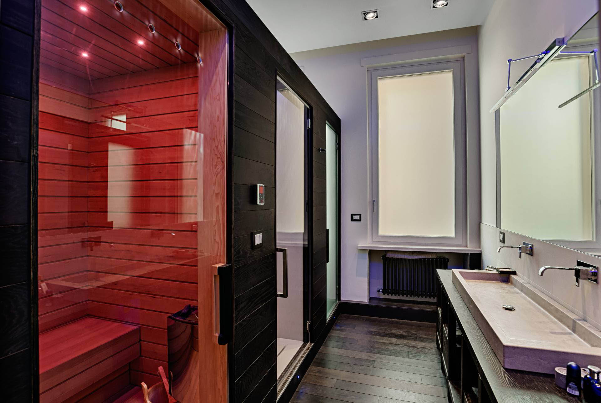 La parte privata della casa oltre ad avere una camera di servizio con bagno sviluppa tre camere da letto, servite da due bagni di cui uno con jacuzzi, sauna e bagno turco oltre ad un’ampia stanza guardaroba/palestra e tre balconcini.