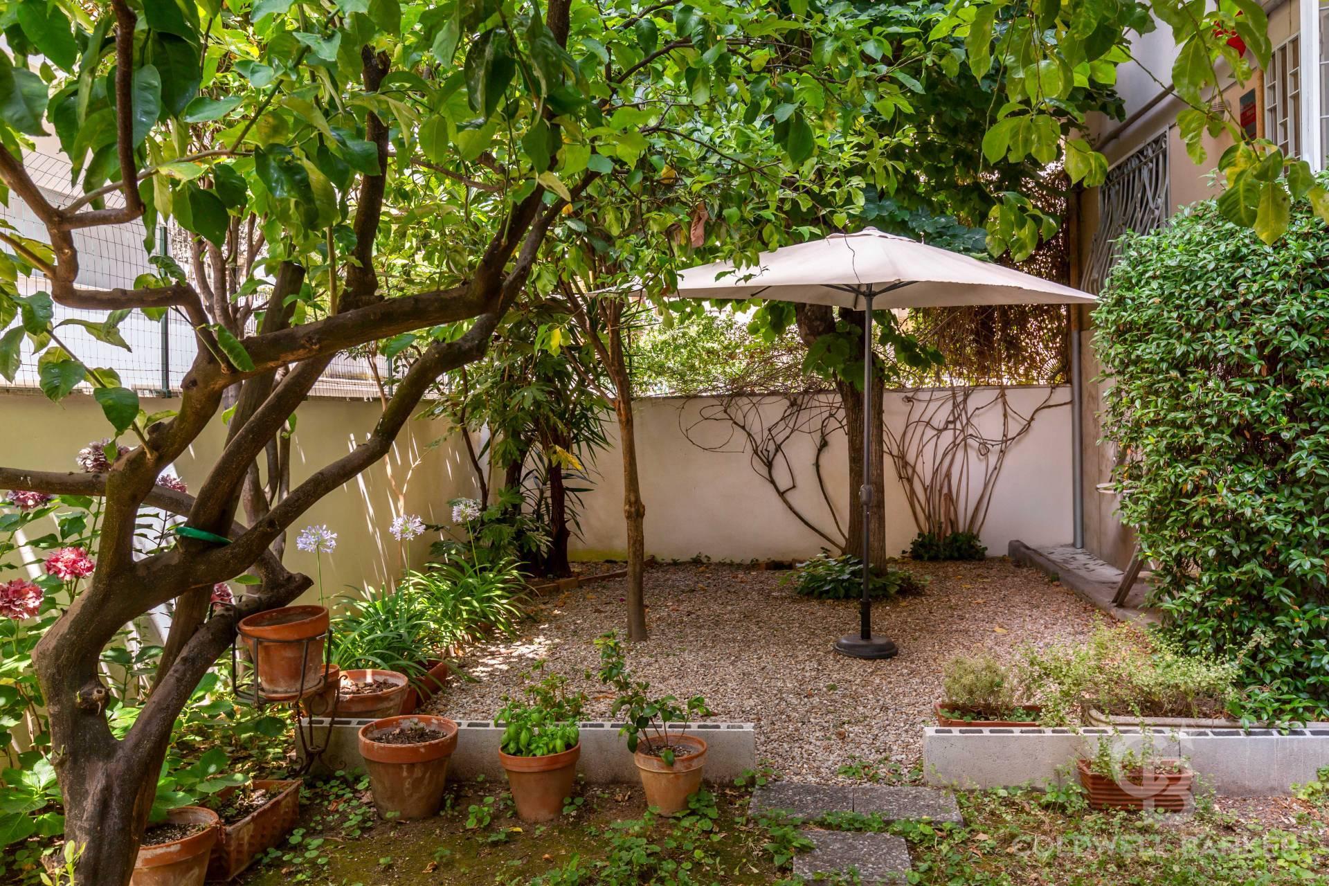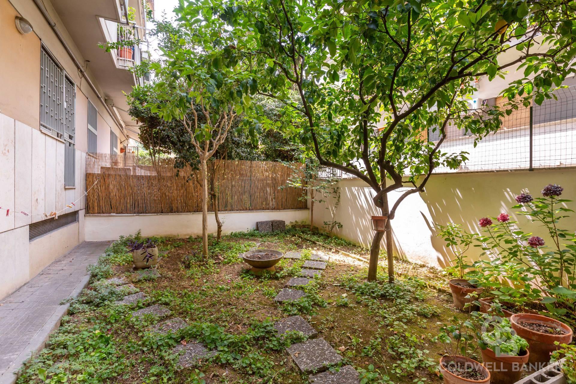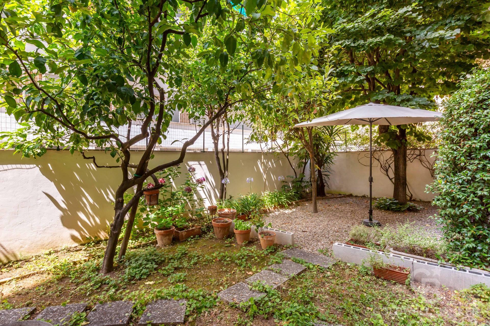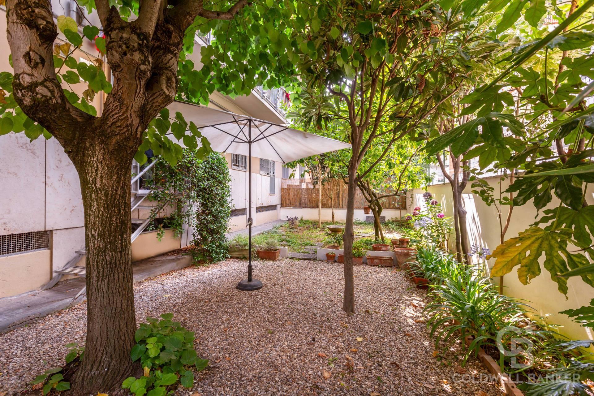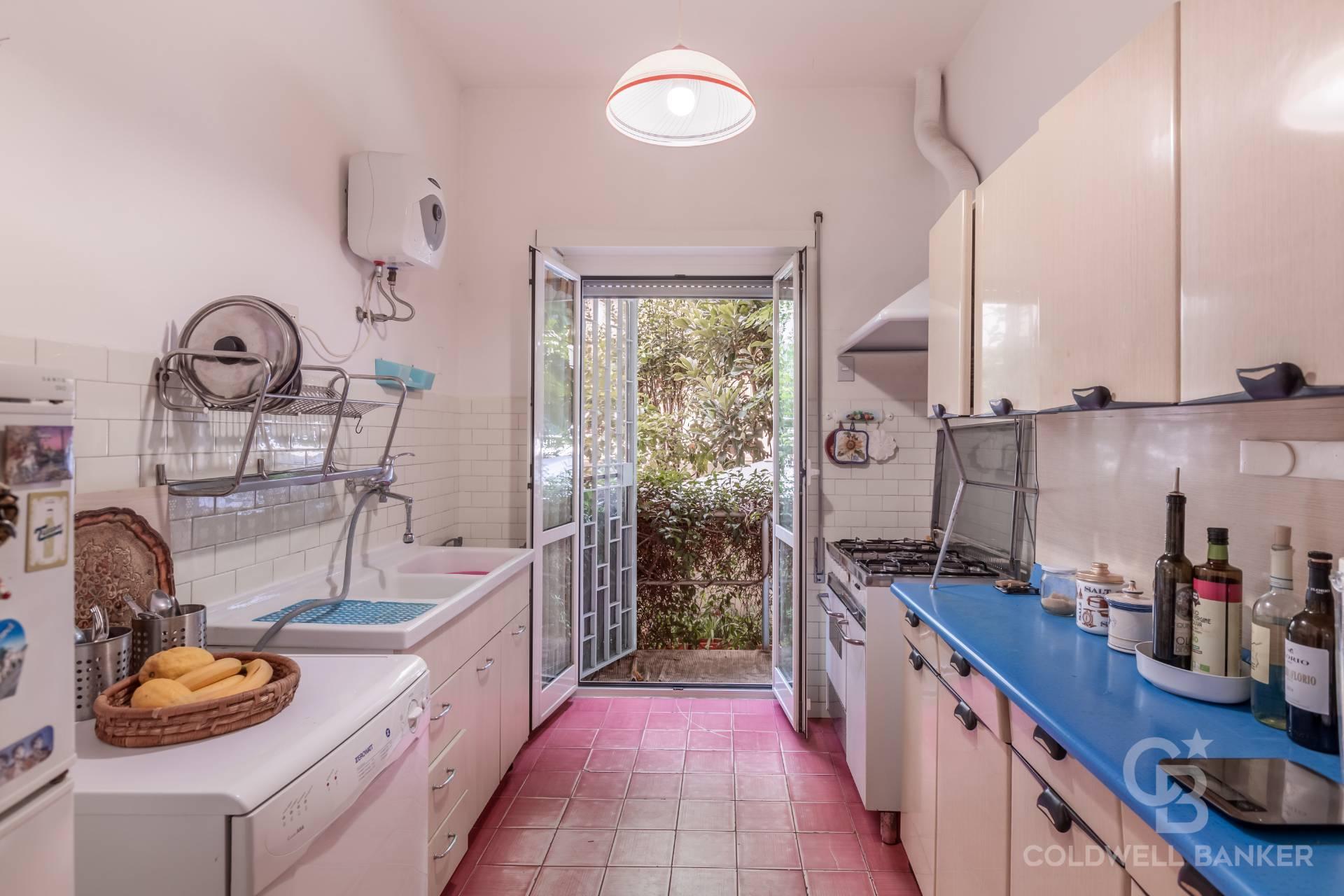 Il salone doppio e la cucina si affacciano sul giardino. L’appartamento ha tre ampie stanze da letto, due bagni e un ambiente di servizio con finestra.