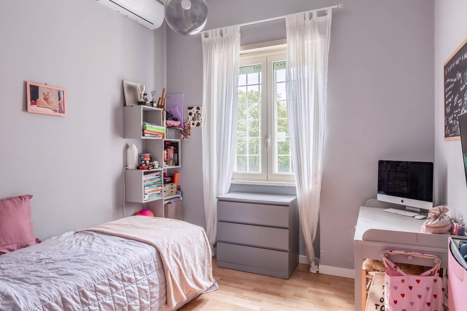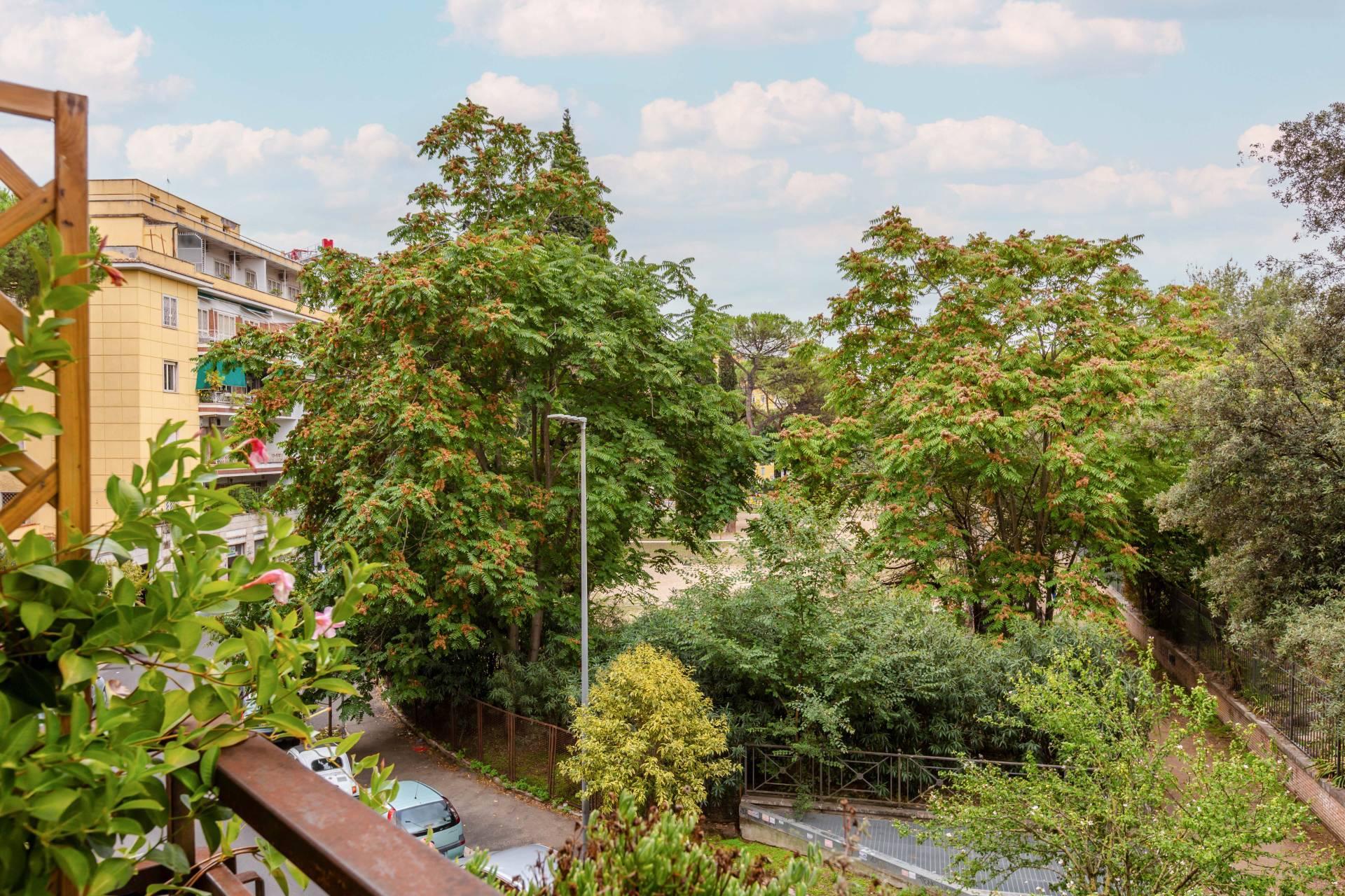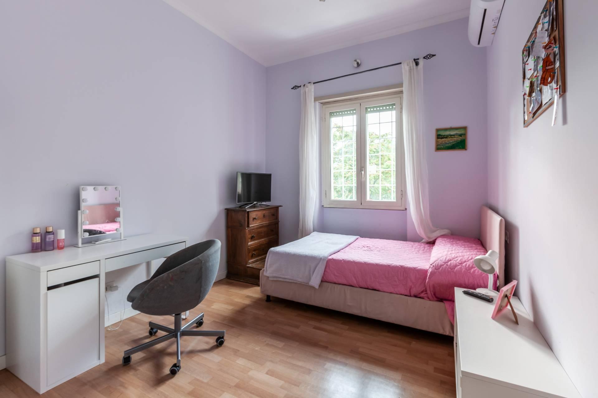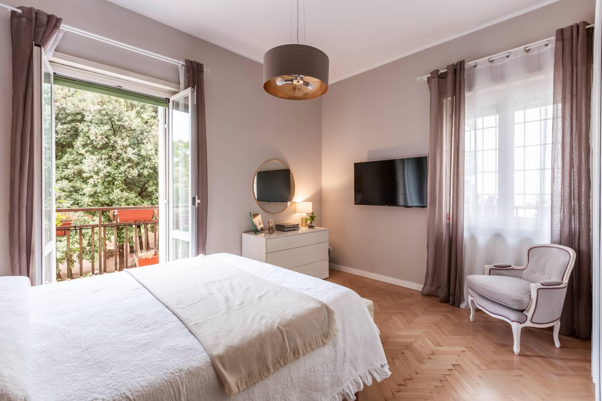 La disposizione interna prevede un un’accogliente zona giorno con cucina attrezzata a vista, suite matrimoniale impreziosita dal doppio affaccio e da cabina armadio ed altre due spaziose camere con affaccio su villa Chigi. Due bagni con finestra completano il layout interno.