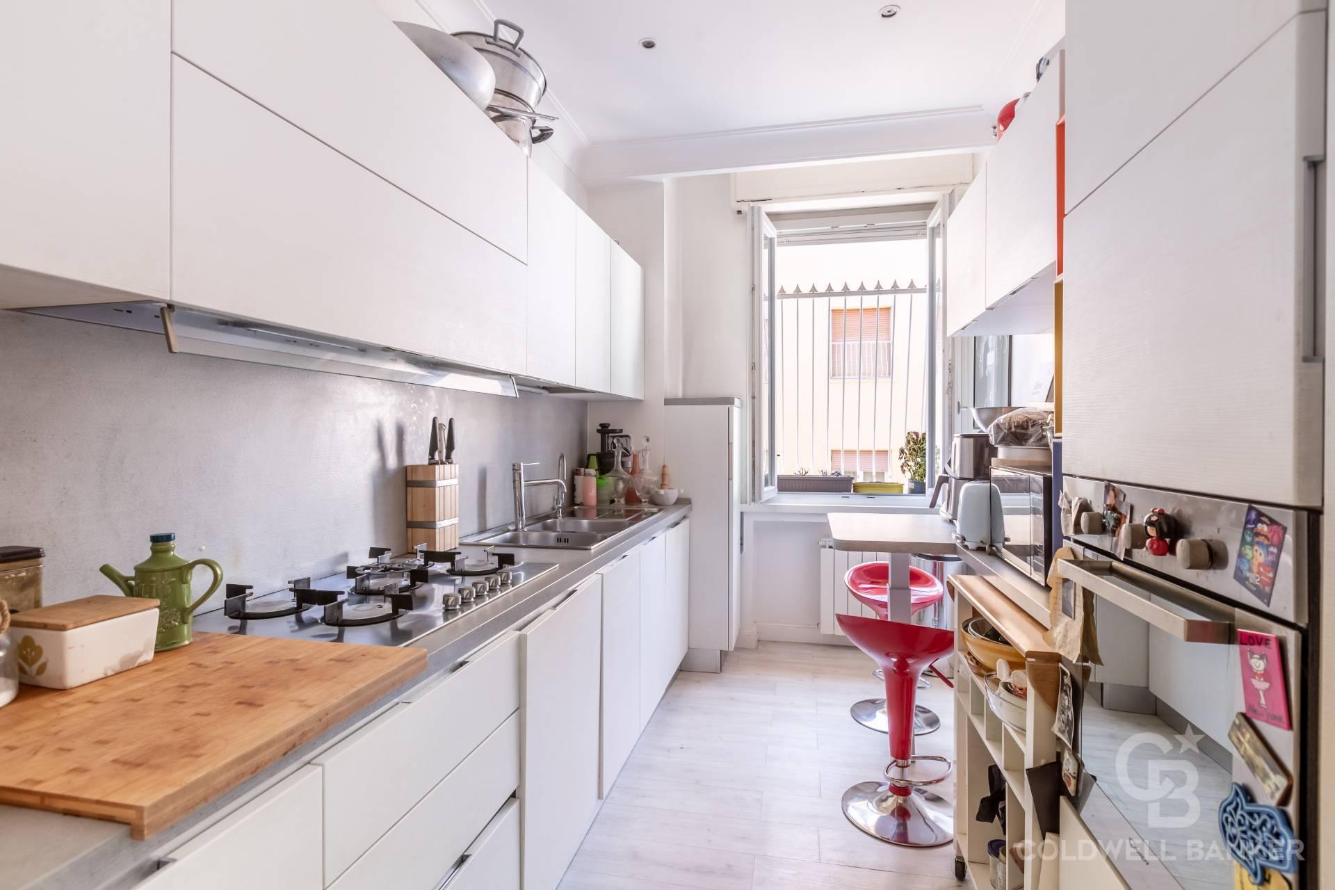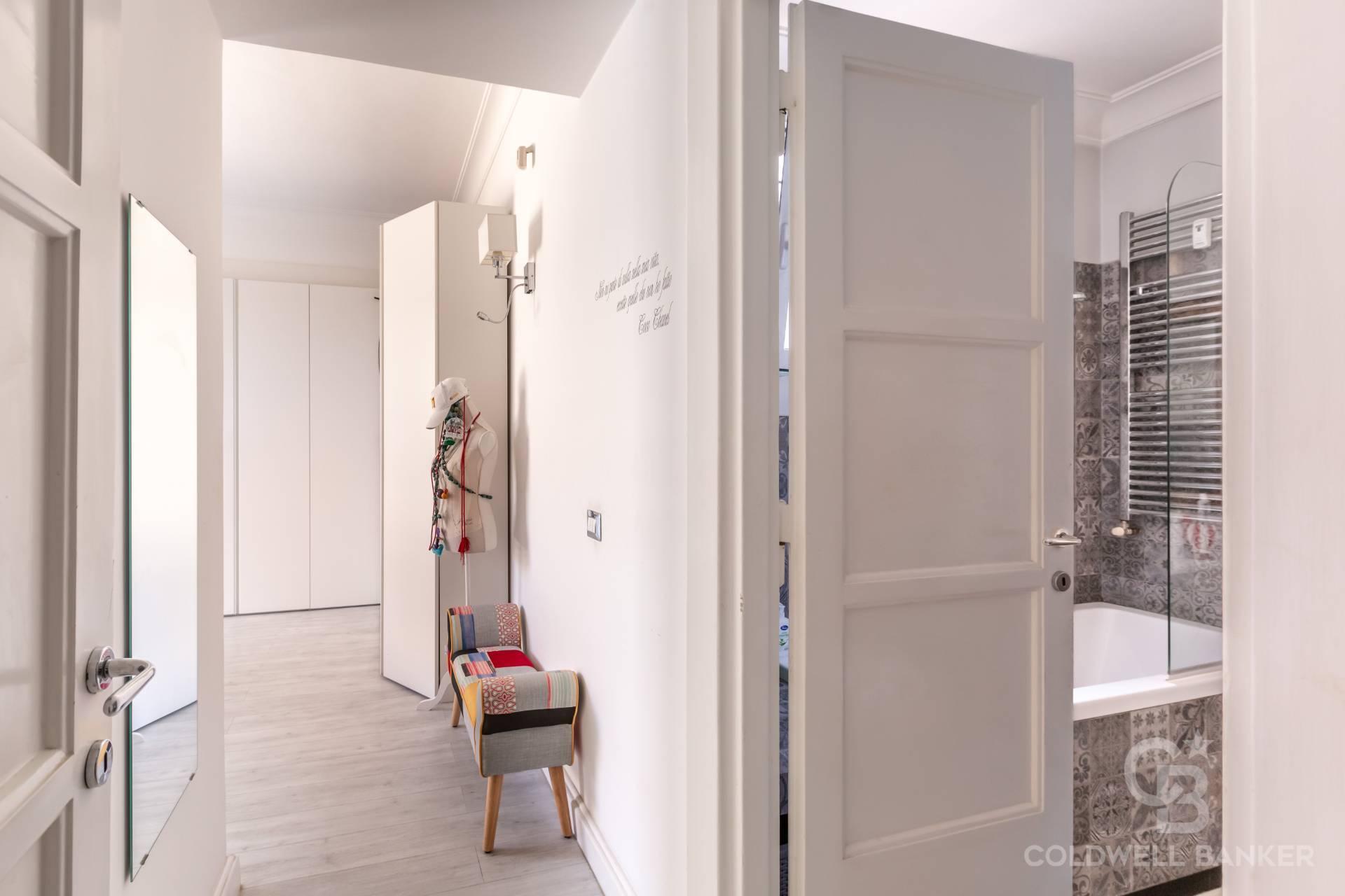 L’ampio ingresso conduce alla zona giorno composta da un luminoso salone doppio con balcone ed una cucina abitabile. La zona notte è invece composta da due confortevoli camere da letto e due bagni, di cui uno en suite, entrambi finemente rifiniti. L’esposizione est-ovest garantisce una notevole luminosità durante tutta la giornata.
