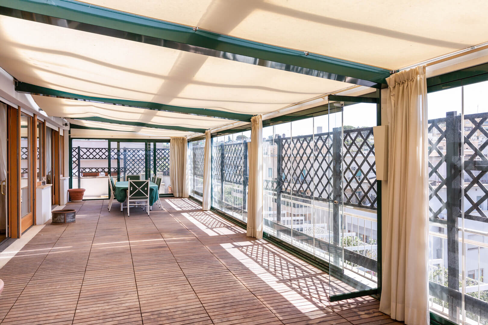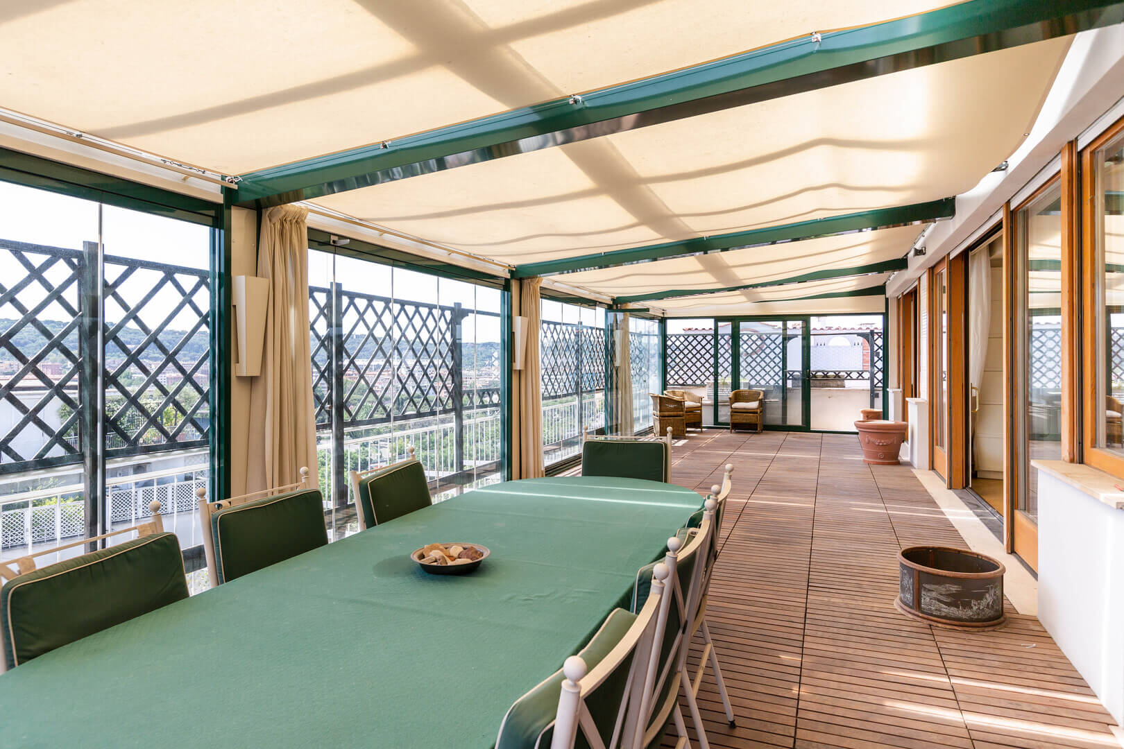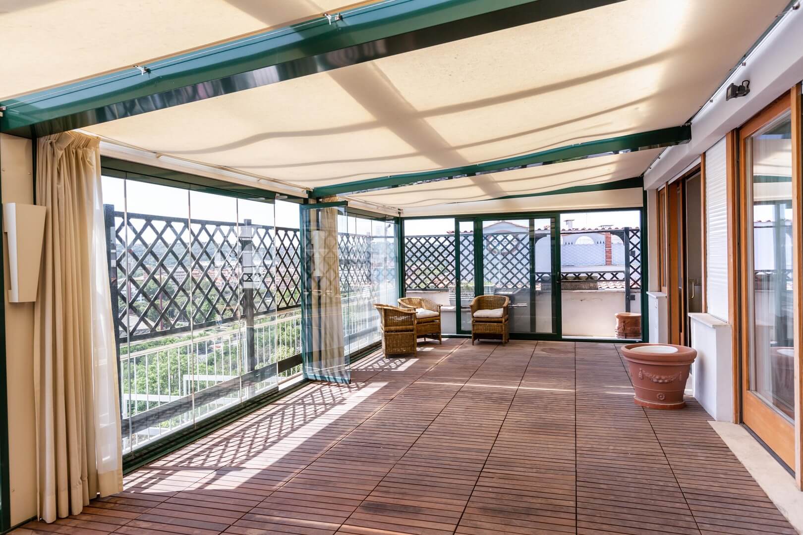 Il terrazzo principale, di 80 metri quadrati, ha una copertura in vetro trasparente che permette di utilizzarlo anche durante l’inverno ed è accessibile dal salone mediante le grandi finestre scorrevoli che delimitano il salone.
