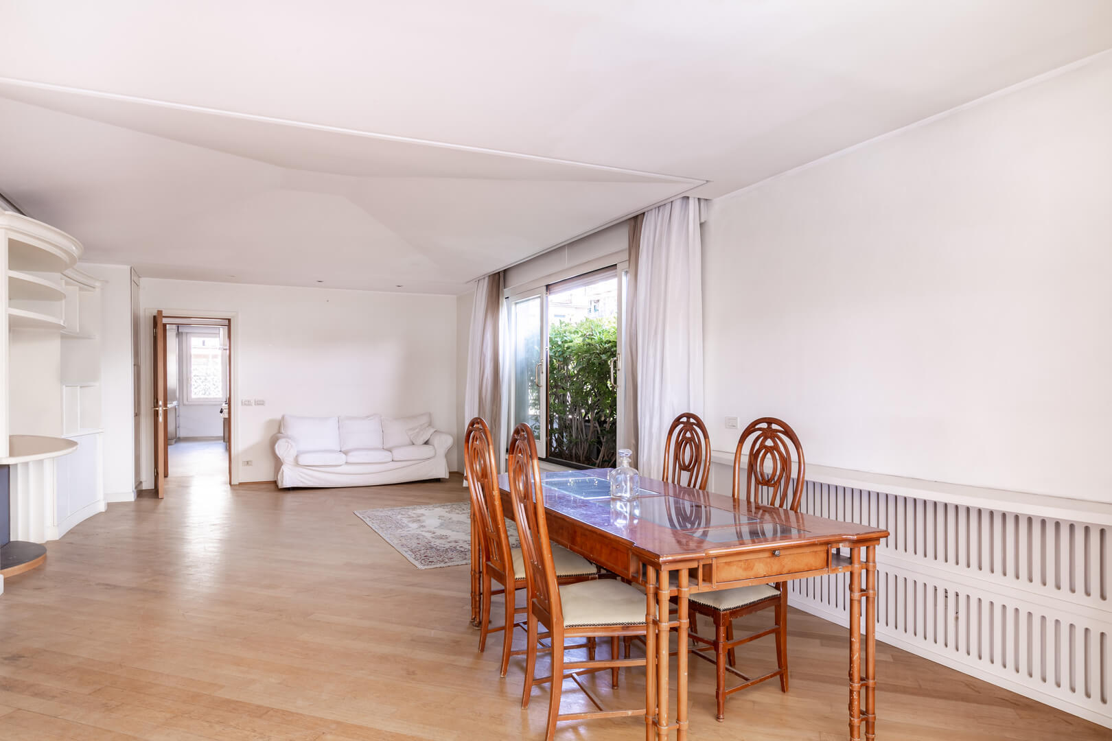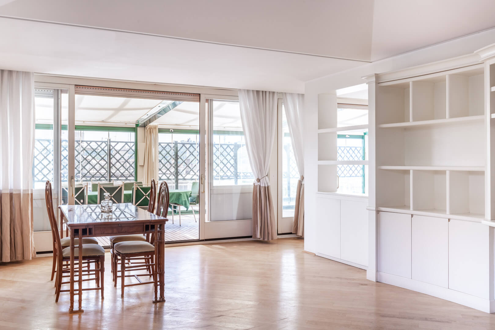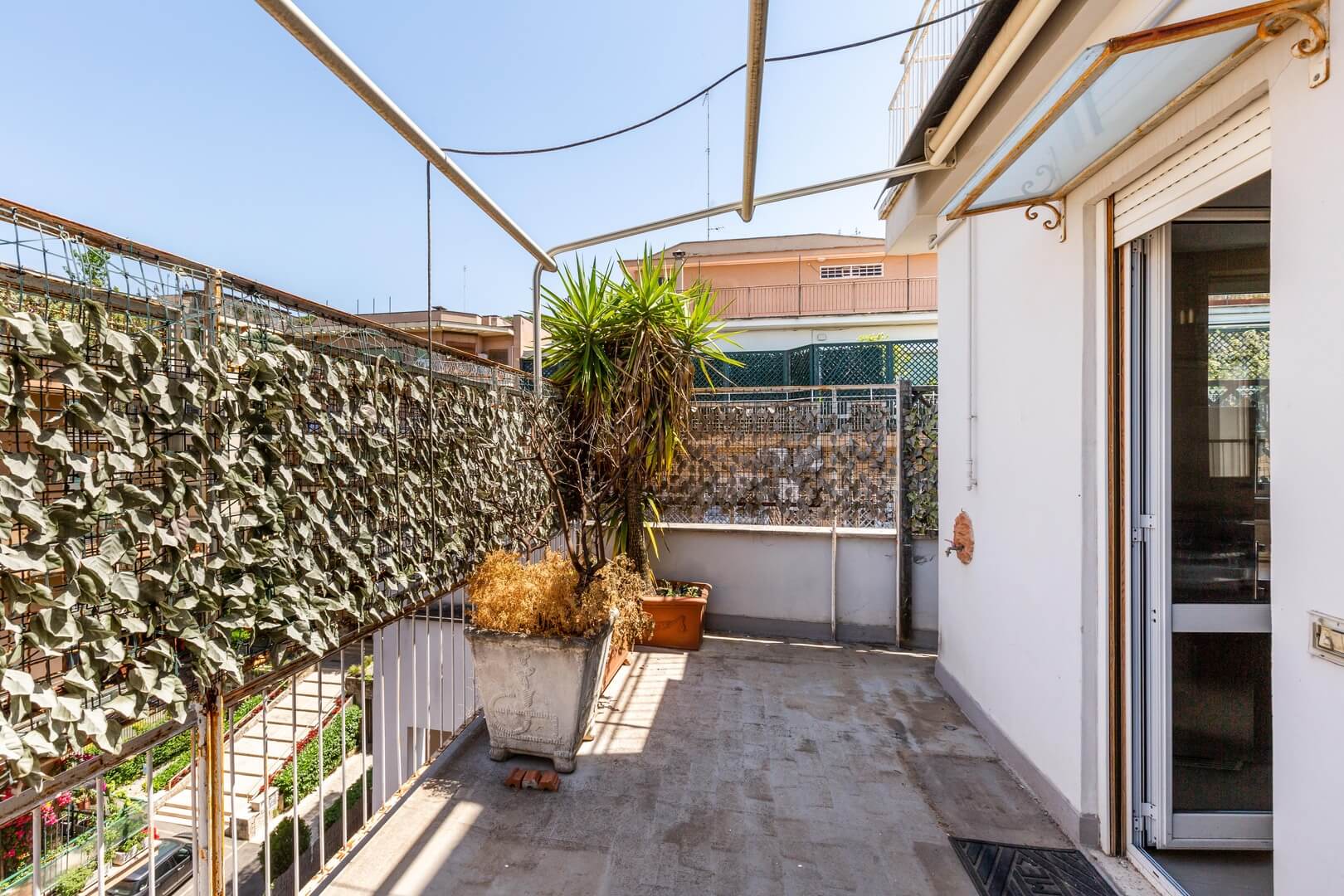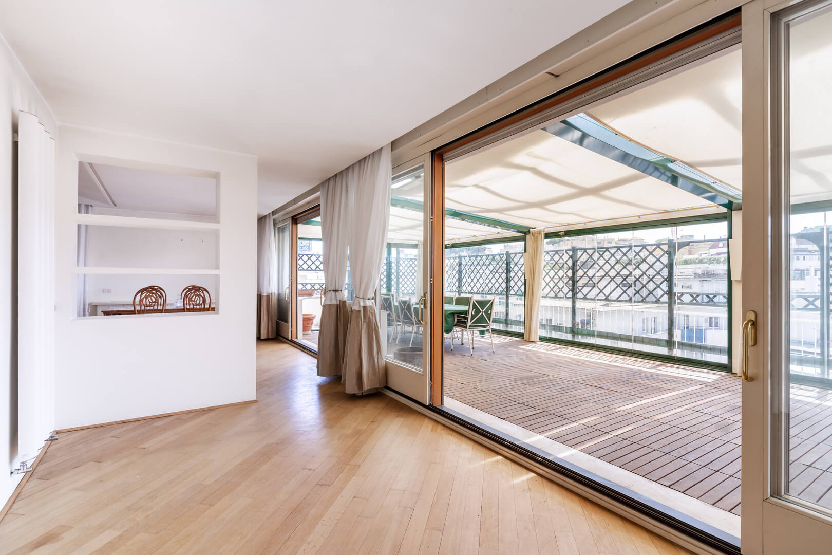 Il terrazzo principale, di 80 metri quadrati, ha una copertura in vetro trasparente che permette di utilizzarlo anche durante l’inverno ed è accessibile dal salone mediante le grandi finestre scorrevoli che delimitano il salone.