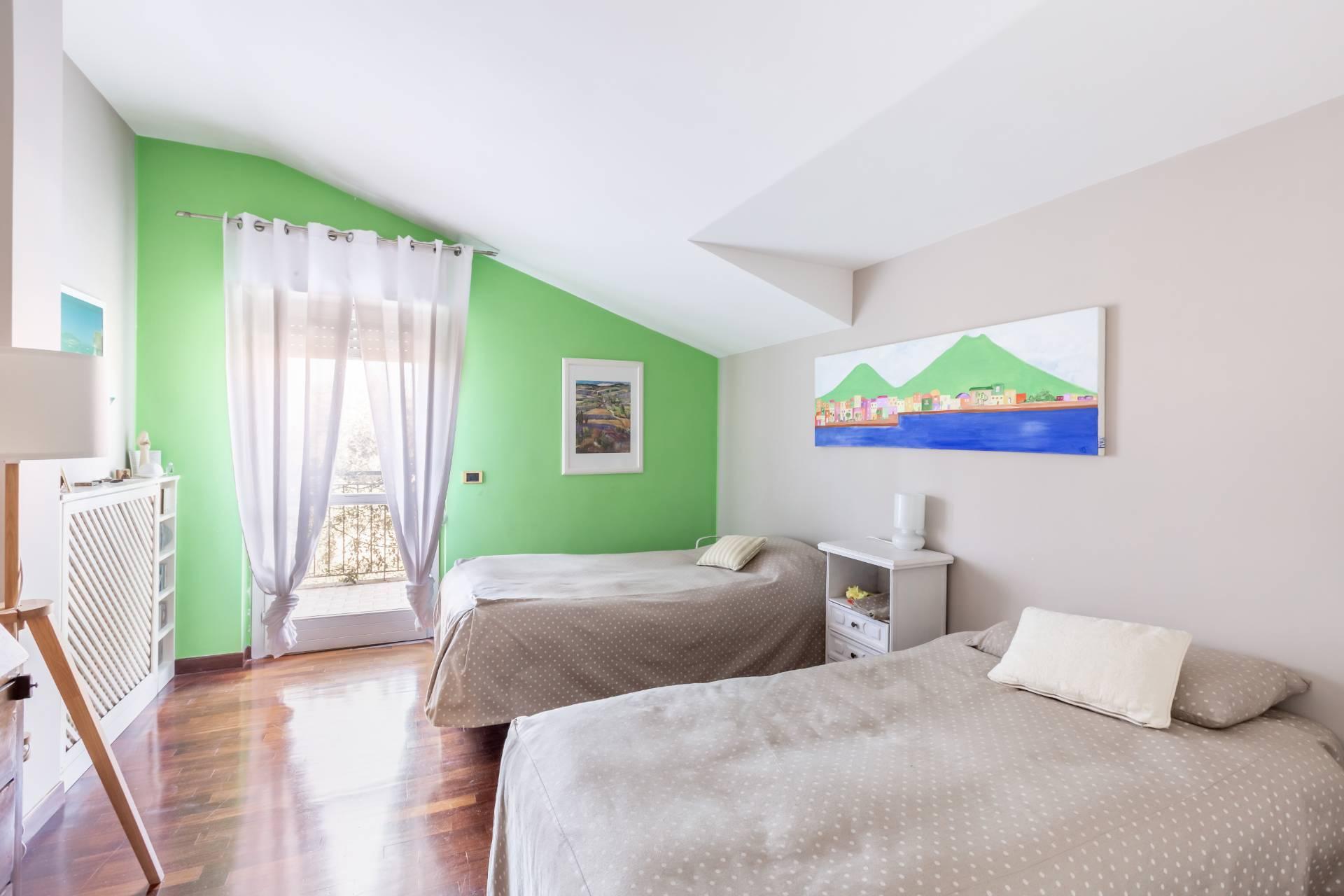 Al primo piano la zona notte è composta da due camere da letto matrimoniali, di cui una con accesso al balcone privato, e un bagno finestrato di generose dimensioni.